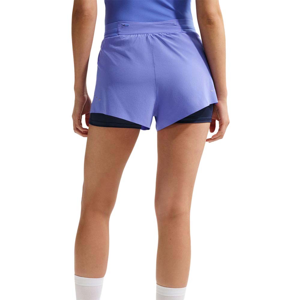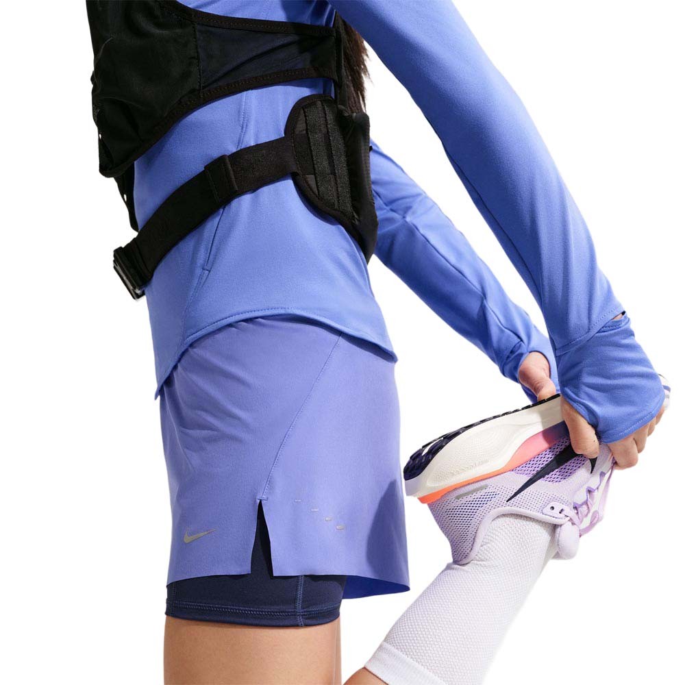 Pantaloncini running Nike Swift 2 in 1 sapphire da donna, vita media, interni aderenti e strato esterno ampio per copertura, comfort e spazio extra.