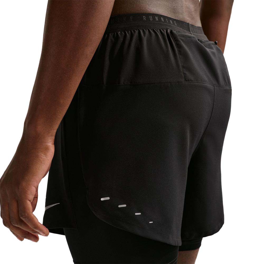 Pantaloncini running Nike Stride 5 inch Hybrid 2 in 1 neri da uomo, con strato woven e interno in spandex, pensati per massima elasticità e spazio intelligente.