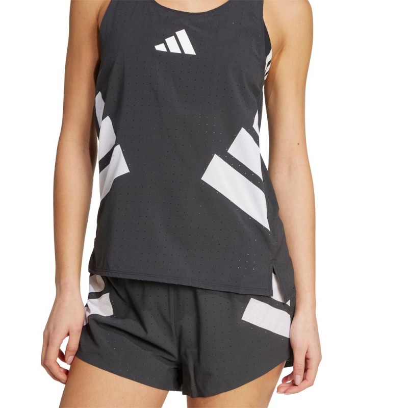 Canotta running Adizero Road To Records nera da donna, leggera e traforata, pronta a spingere al massimo dal primo passo al traguardo.