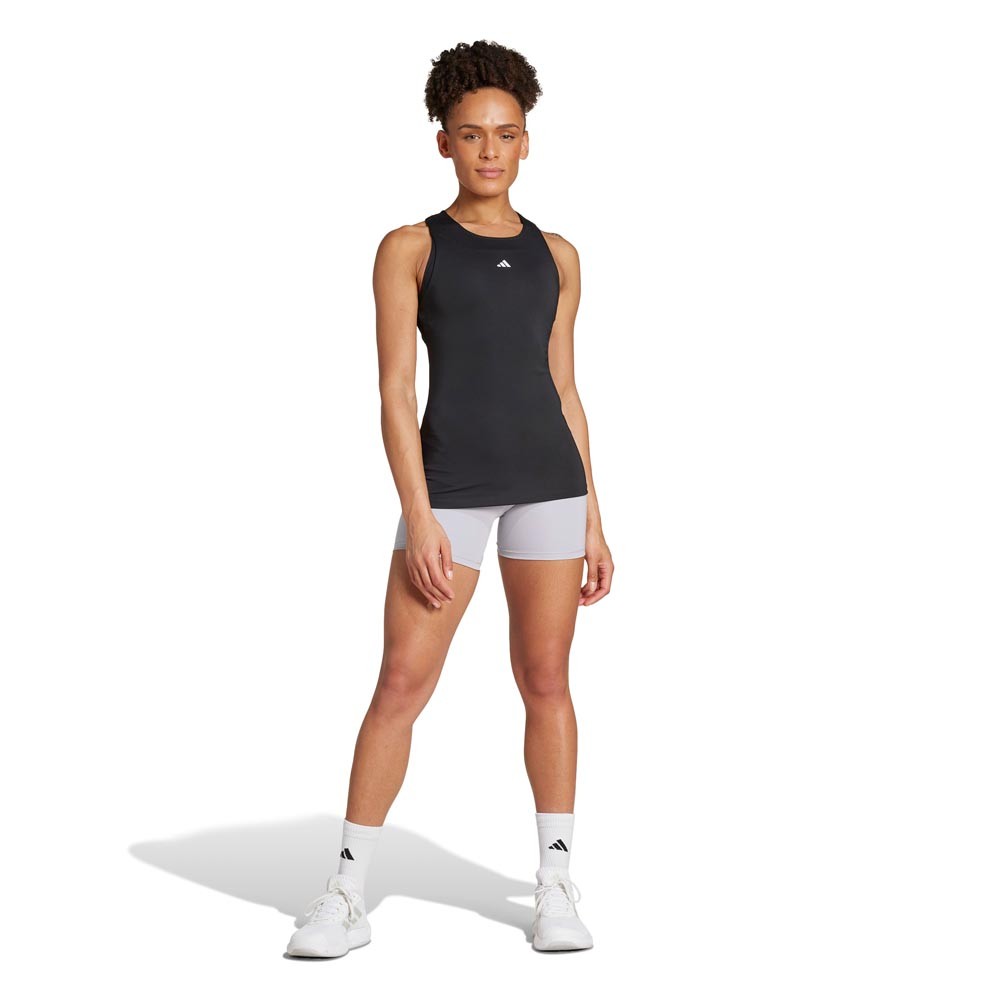 Canotta palestra adidas Techfit nera da donna, a compressione con taglio olimpionico, pensata per allenamenti ad alta intensità con potenza concentrata.