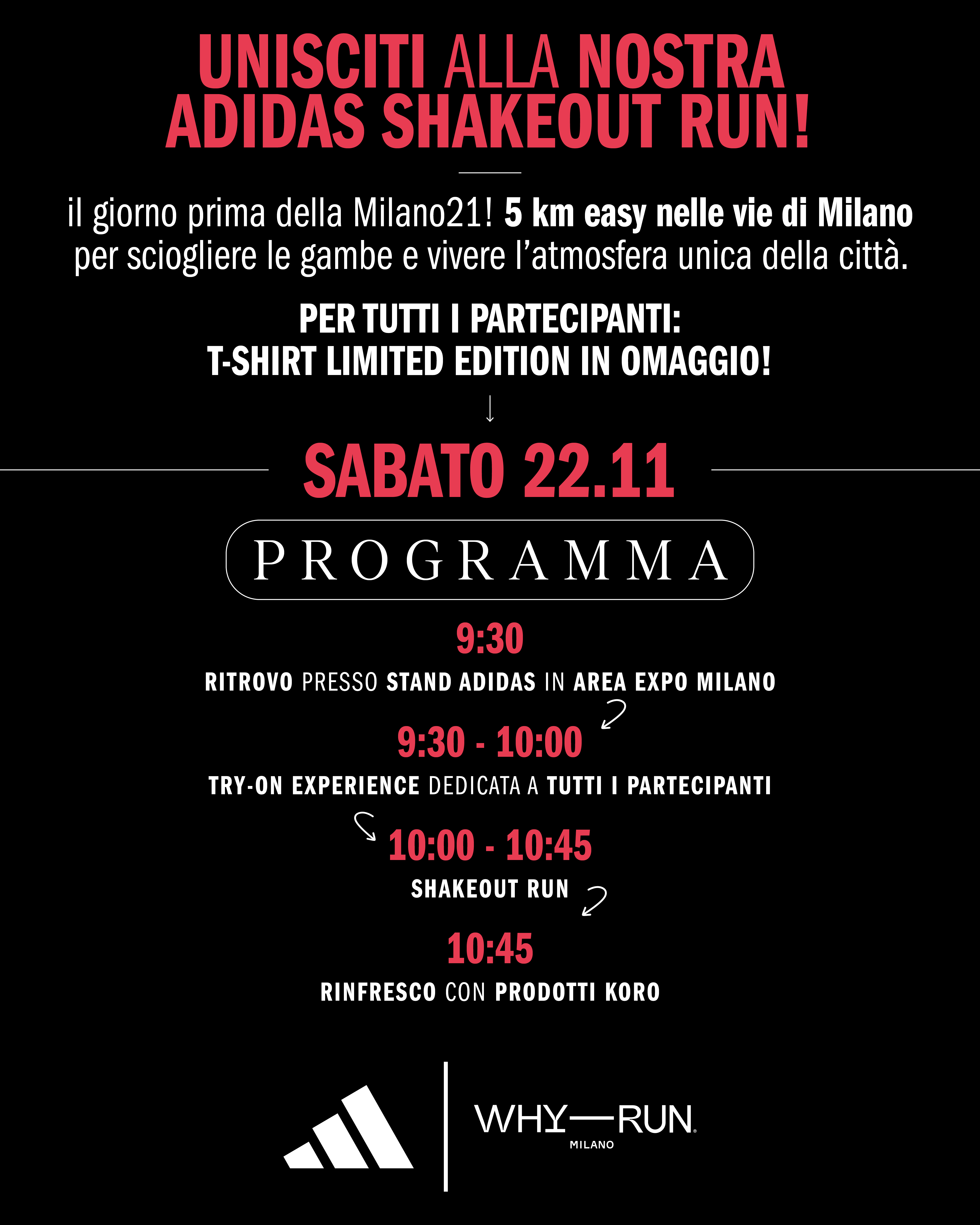 Unisciti alla nostra adidas Shakeout Run il giorno prima della Milano21! 5 km easy tra le vie di Milano per vivere insieme l’energia della città alla vigilia della gara.