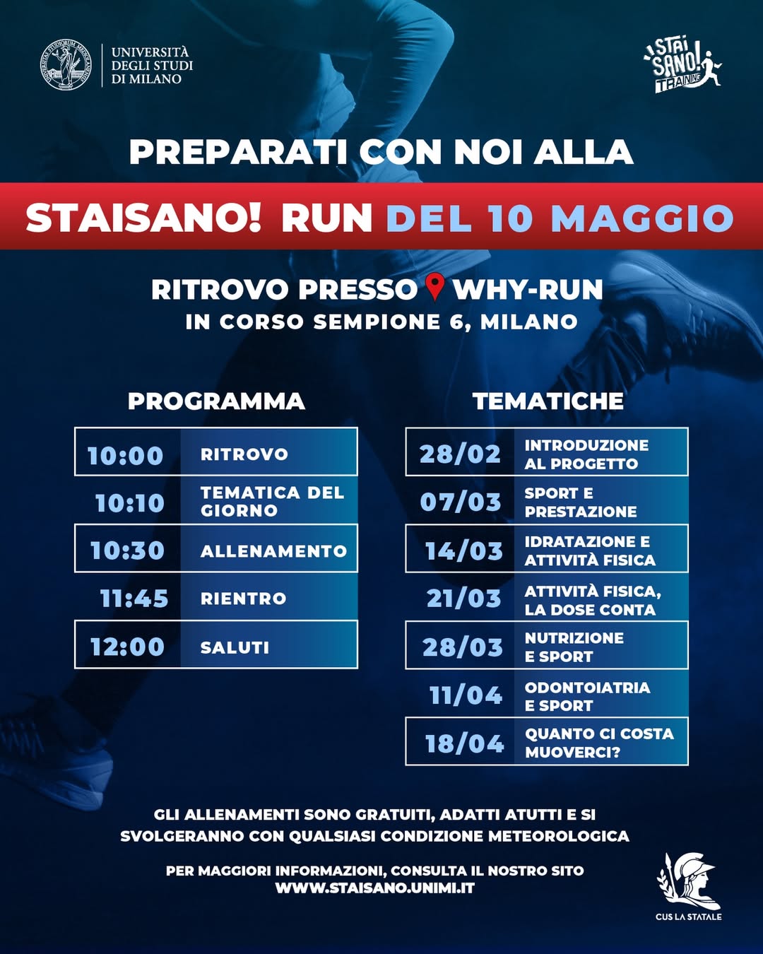 📅 Sabato, ore 10.00 – 12.00 📍 Ritrovo presso Why Run – Corso Sempione 6, Milano Breve momento di confronto con gli esperti di Salute UniMi, a seguire allenamento al Parco Sempione guidato dai coach di Scienze Motorie.