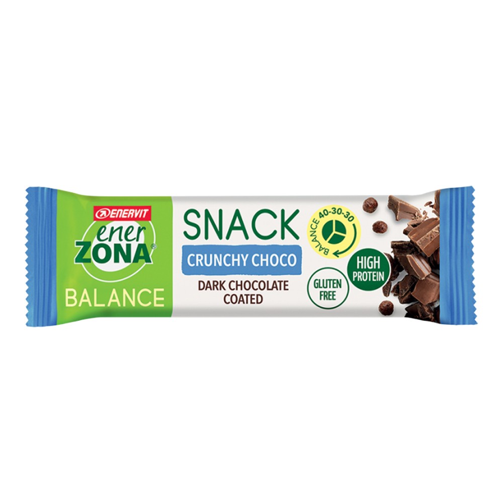 Enerzona Crunchy Choco è la barretta proteica di Enervit ricoperta di cioccolato fondente, senza Glutine. Barretta 33 gr
