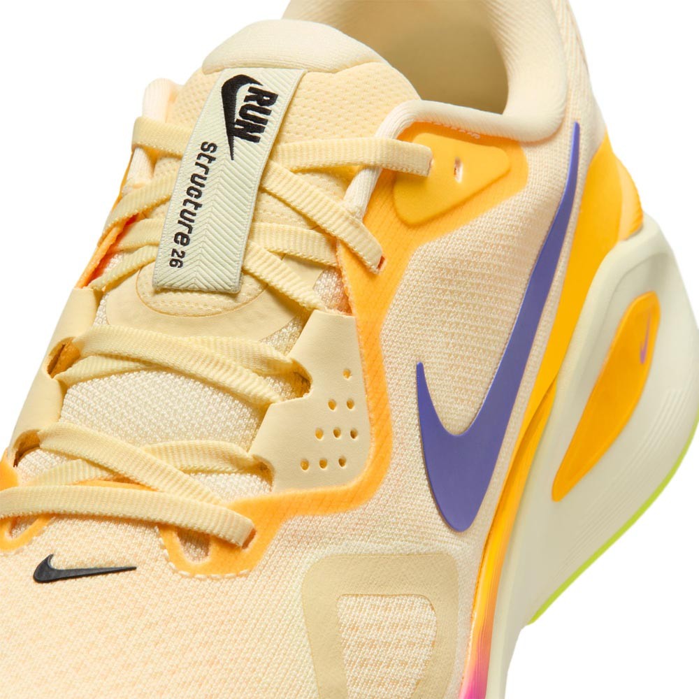 La Structure 26 è progettata per la stabilità. L'intersuola in schiuma ReactX a tutta lunghezza offre il 13 percento in più di reattività, mentre il sistema di supporto nell'area mediale avvolge l'arco plantare per una transizione sicura. Il mesh tecnico e il collare morbido garantiscono comfort per un'andatura solida.