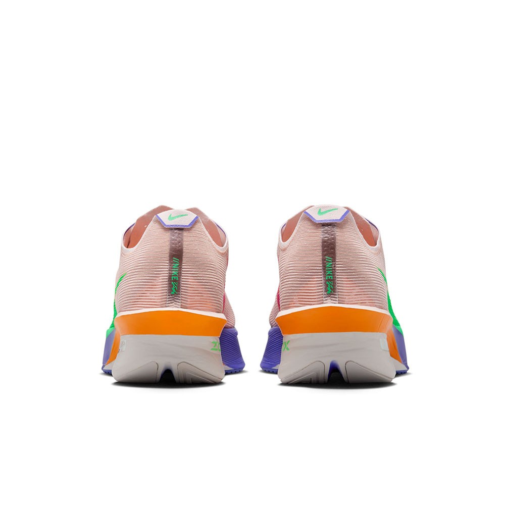 Rispetto alla Vaporfly 3, la Vaporfly 4 riduce peso in ogni componente — tomaia, intersuola e suola — mantenendo la massima efficienza. La schiuma ZoomX, ora ancora più leggera e reattiva, offre un ritorno di energia esplosivo, mentre la piastra in fibra di carbonio Flyplate a tutta lunghezza, con angolo più alto e drop inferiore, garantisce una spinta propulsiva costante e un’andatura più naturale.